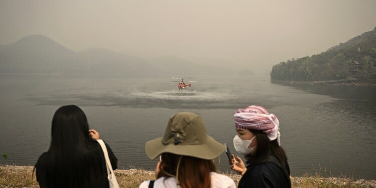 Journalists watch as a firefighting helicopter picks up water to combat forest fires amid heavy air pollution at Mae Ngat Somboon Chon Dam in the northern Thai province of Chiang Mai on Mar 16, 2024 (Photo by Lillian SUWANRUMPHA / AFP)