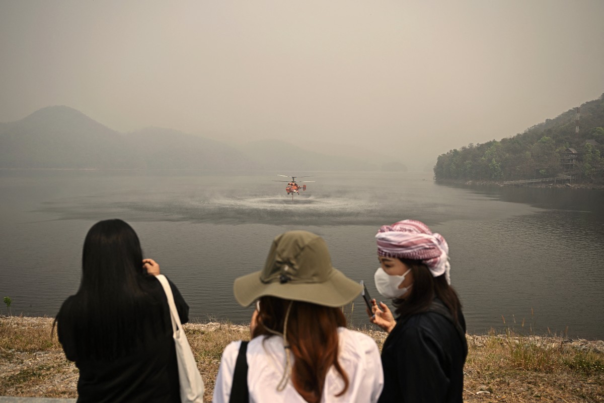 Journalists watch as a firefighting helicopter picks up water to combat forest fires amid heavy air pollution at Mae Ngat Somboon Chon Dam in the northern Thai province of Chiang Mai on March 16, 2024. (Photo by Lillian SUWANRUMPHA / AFP)