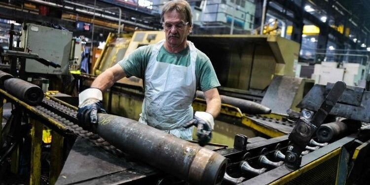 An employee handles 155mm caliber shells after being manufactured in Pennsylvania, US (AFP or licensors)